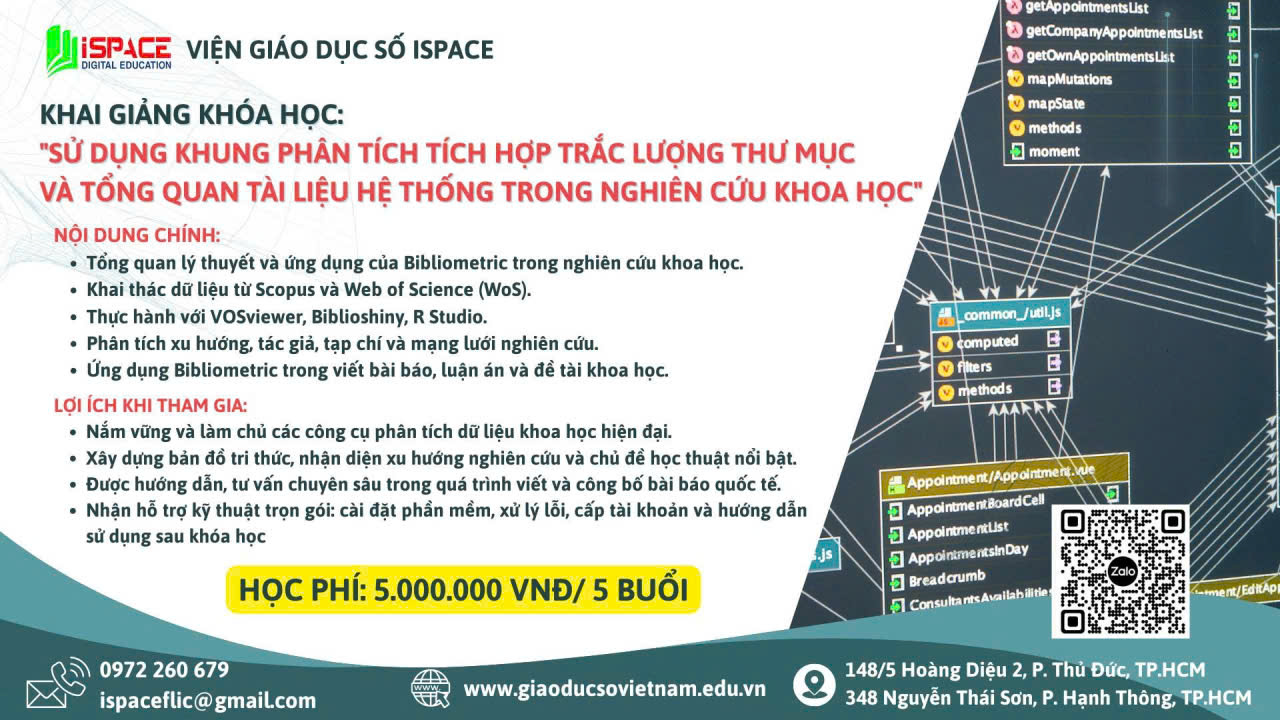 Chương trình sẽ khai giảng vào ngày dự kiến được thông báo cụ thể trước khi bắt đầu khóa học nhằm đảm bảo sự chuẩn bị đầy đủ cho các học viên. Buổi khai giảng sẽ giới thiệu tổng quan nội dung, mục tiêu, phương pháp thực hiện cũng như các yêu cầu và điều kiện tham gia. Đây cũng là dịp để học viên gặp gỡ giảng viên, trao đổi thắc mắc và làm quen với các công cụ, phần mềm sẽ sử dụng trong quá trình học tổng quan tài liệu hệ thống kết hợp trắc lượng thư mục.